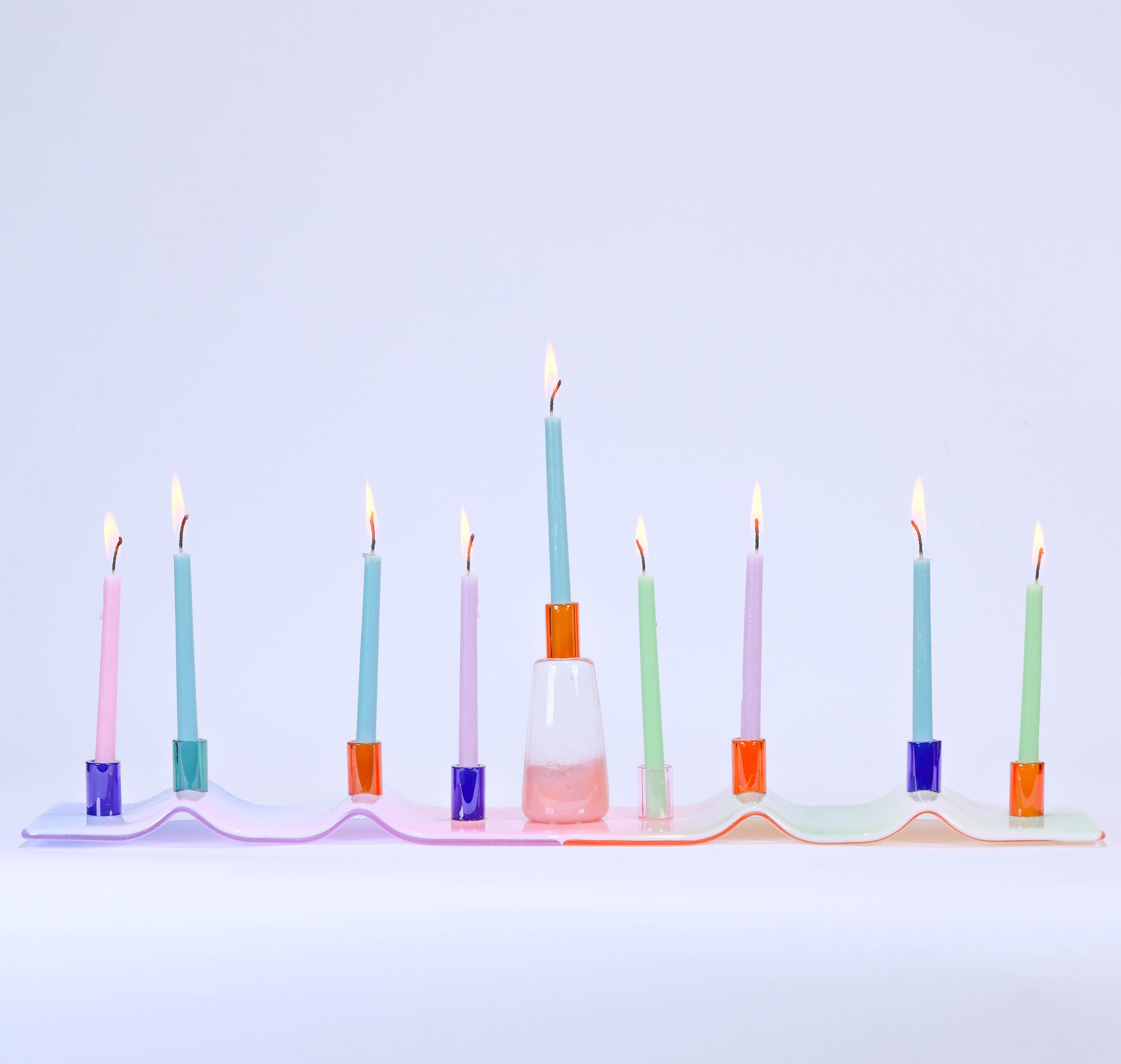 Get ready for the Festival of Lights with a colorful and modern hanukkiah! These pieces are a collaboration between Forman Function and Soft Shapes, and incorporate both artists signature use of color and interesting forms.